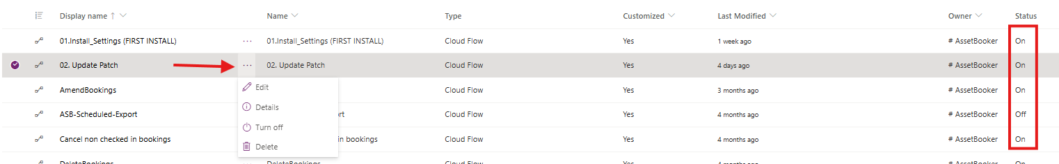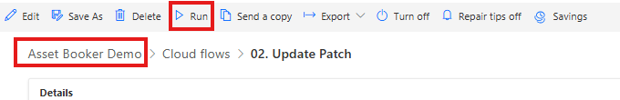 Follow the instructions specific to your current version number and perform only the steps that apply to it. Please note,if you have manually modified the Config table, be aware that updates may overwrite these changes, for some configuration items you will be prompted to choose if you wish to overwrite them, and if you select no you will receive a notification with the changed templates that you can then update yourself at a later point. After the update, reapply your modifications as needed. Click on ‘Cloud flows‘ on the left menu, then locate ’02. Update Patch’, this is the only flow with needs to be run. In previous versions of Asset Booker you may have seen patches for specific versions, these have now been unified into a single patch process.