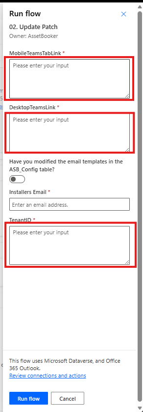 When the flow is selected to run, you will be prompted to enter the Teams tab links, as well as the Installers Email, Tenant ID (This can be found in the link for the Teams tabe.g. [Teams Tab Link]&tenantId=[Tenant ID Here]) and a toggle for if email templates have been modified.