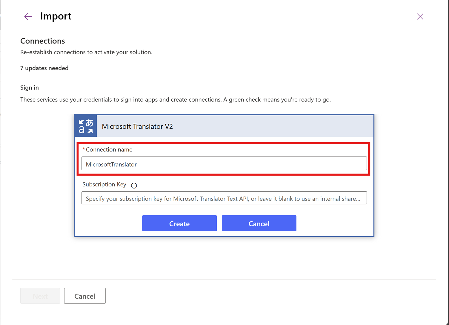 On import of the solution, you will be prompted to create a new Microsoft Translator V2 connection. Enter a suitable name e.g. MicrosoftTranslator and select Create.