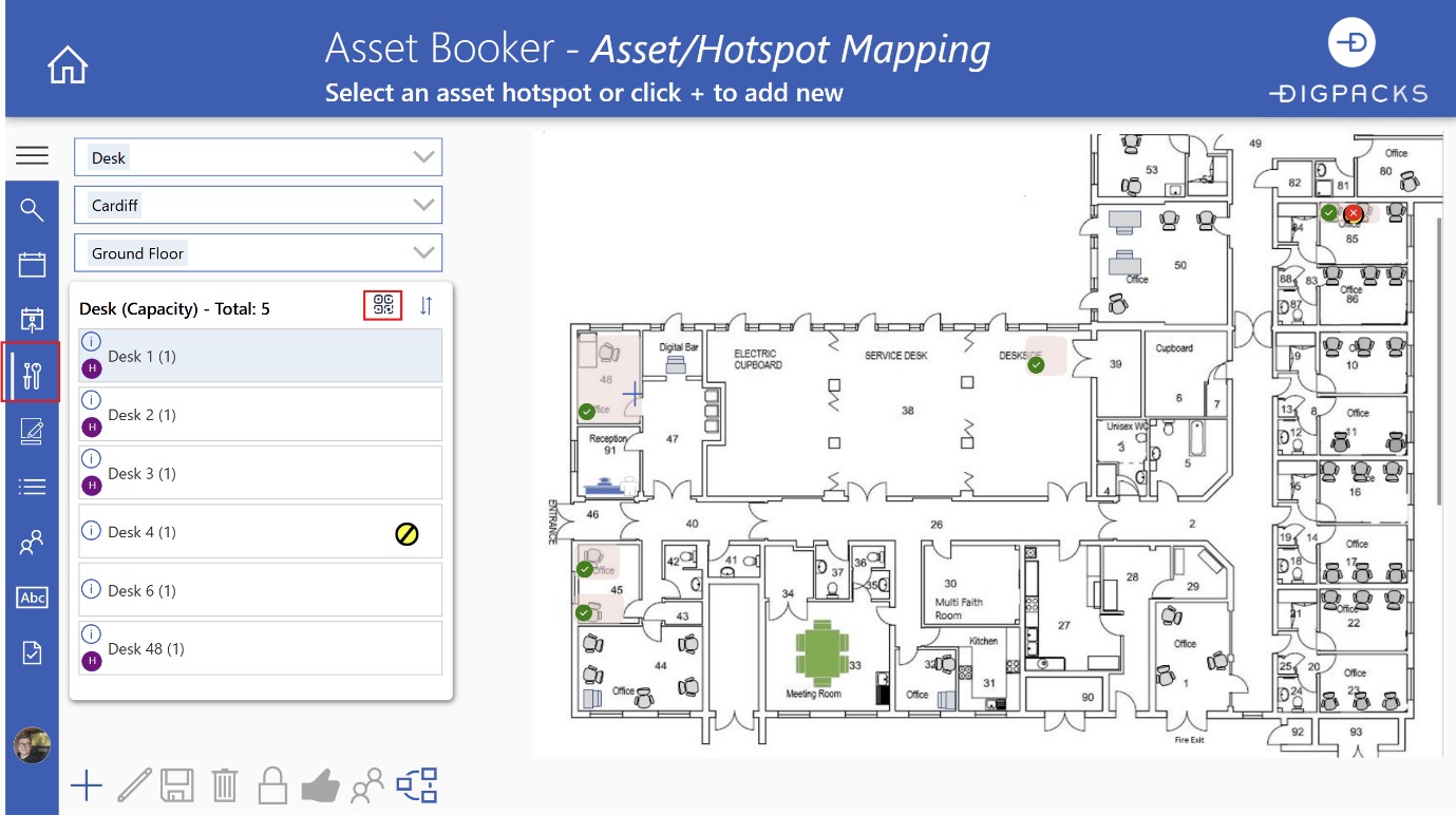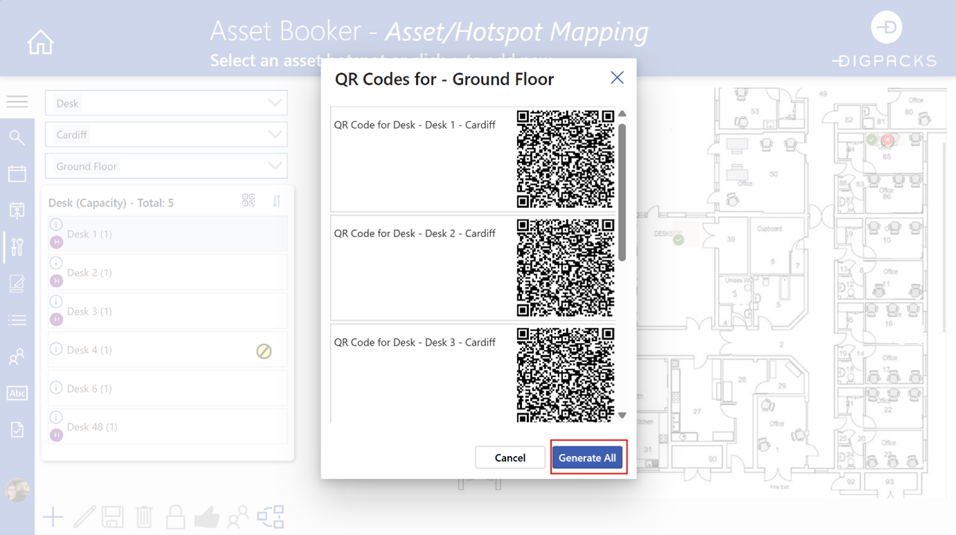 Once this has been completed, you can view the Booking Admin screen to see and export QR codes for the selected asset list.